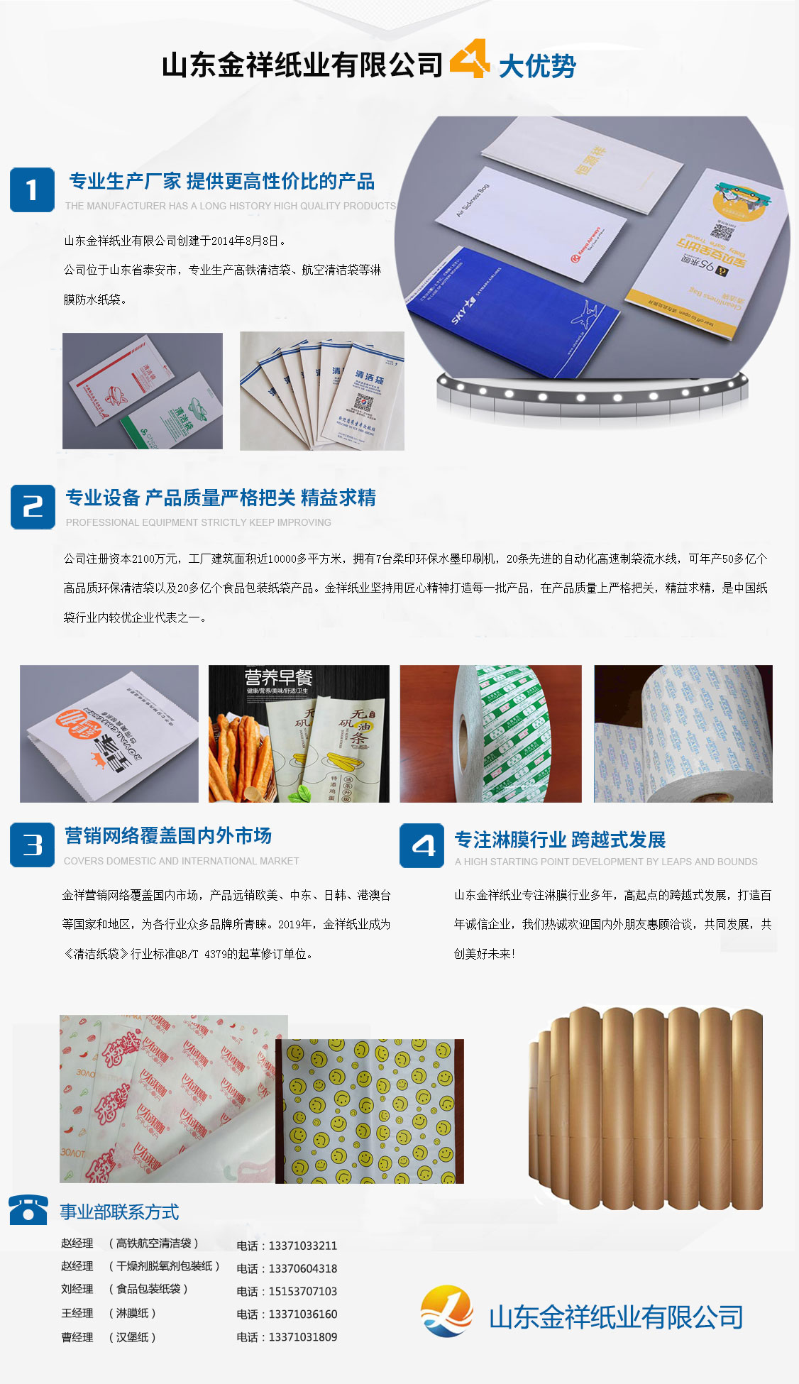 山東金祥紙業(yè)有限公司創(chuàng)建于2014年8月8日,公司位于山東泰安,專業(yè)生產(chǎn)高鐵清潔袋、航空清潔袋等淋膜防水紙袋。公司注冊(cè)資本2100萬元,工廠建筑面積近10000多平方米,擁有7臺(tái)柔印環(huán)保水墨印刷機(jī),20條先進(jìn)的自動(dòng)化高速制袋流水線,可年產(chǎn)50多億個(gè)高品質(zhì)環(huán)保清潔袋以及20多億個(gè)食品包裝紙袋產(chǎn)品。金祥紙業(yè)堅(jiān)持用匠心精神打造每一批產(chǎn)品,在產(chǎn)品質(zhì)量上嚴(yán)格把關(guān),精益求精,是中國紙袋行業(yè)內(nèi)較優(yōu)企業(yè)代表之一。金祥營銷網(wǎng)絡(luò)覆蓋國內(nèi)市場,產(chǎn)品遠(yuǎn)銷歐美、中東、日韓、港澳臺(tái)等國家和地區(qū),為各行業(yè)眾多品牌所青睞。2019年,金祥紙業(yè)成為《清潔紙袋》行業(yè)標(biāo)準(zhǔn)QB/T 4379的起草修訂單位。